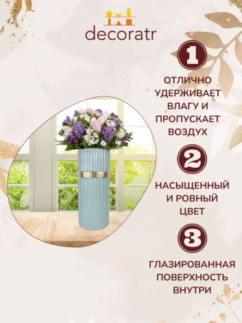 Ваза керамическая голубая с золотом, высокая и большая, высота 22 см, настольная, глянцевая и непрозрачная, с золотым ободком.Вазочка подходит для живых цветов. Использовать можно и для сухоцветов. Прочный материал и качественное покрытие.Красивая ваза - это универсальный подарок для любой женщины. Этот декор для дома станет ярким и необычным акцентом в вашем интерьере.Создайте волнение и радость в сердце вашей мамы, вручив ей потрясающую классическую вазу, которая станет символом вашей любви и оживит ее дом.Погрузитесь в увлекательное путешествие воспоминаний и подарите пожилым людям великолепную вазу в стиле лофт, чтобы наполнить их дом яркими красками!Подарите учителю вдохновение в виде элегантной вазы в дизайне сканди, которая приковывает взгляд своим изысканным дизайном и красотой.Элегантный элемент декора, она добавит уют в интерьер и украсит стол. Поставьте на полку, в при этом удобно будет использовать искусственные цветы. Подойдет со свежими цветами и для комода.Классическая ваза DECORATR отличается уникальным дизайном и внешним ...