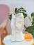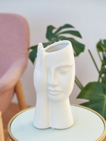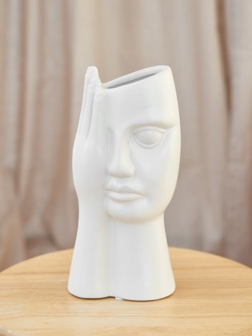 Ваза керамическая белая в форме ладони, закрывающей лицо девушки, высокая и большая, высота 27 см, настольная, матовая и непрозрачная, без декора.